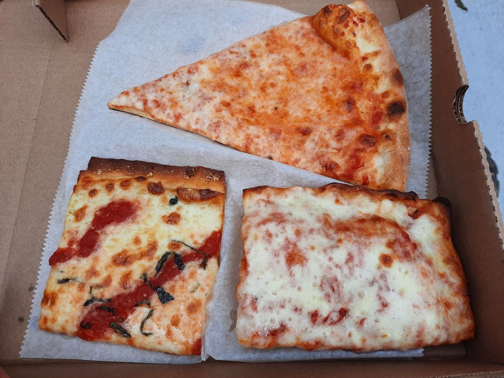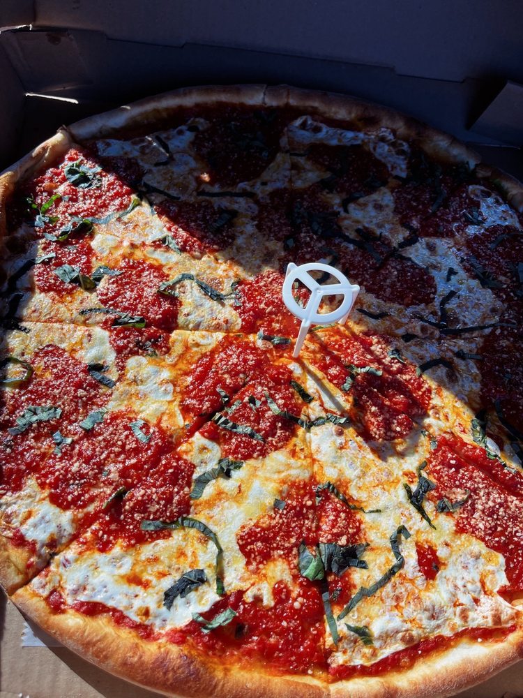 Tomato sauce, parmigiano, mozzarella, garlic puree and fresh basil. Sicilian.