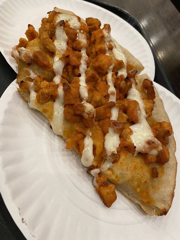 Hot sauce, blue cheese, mozzarella, Buffalo chicken, and lettuce.