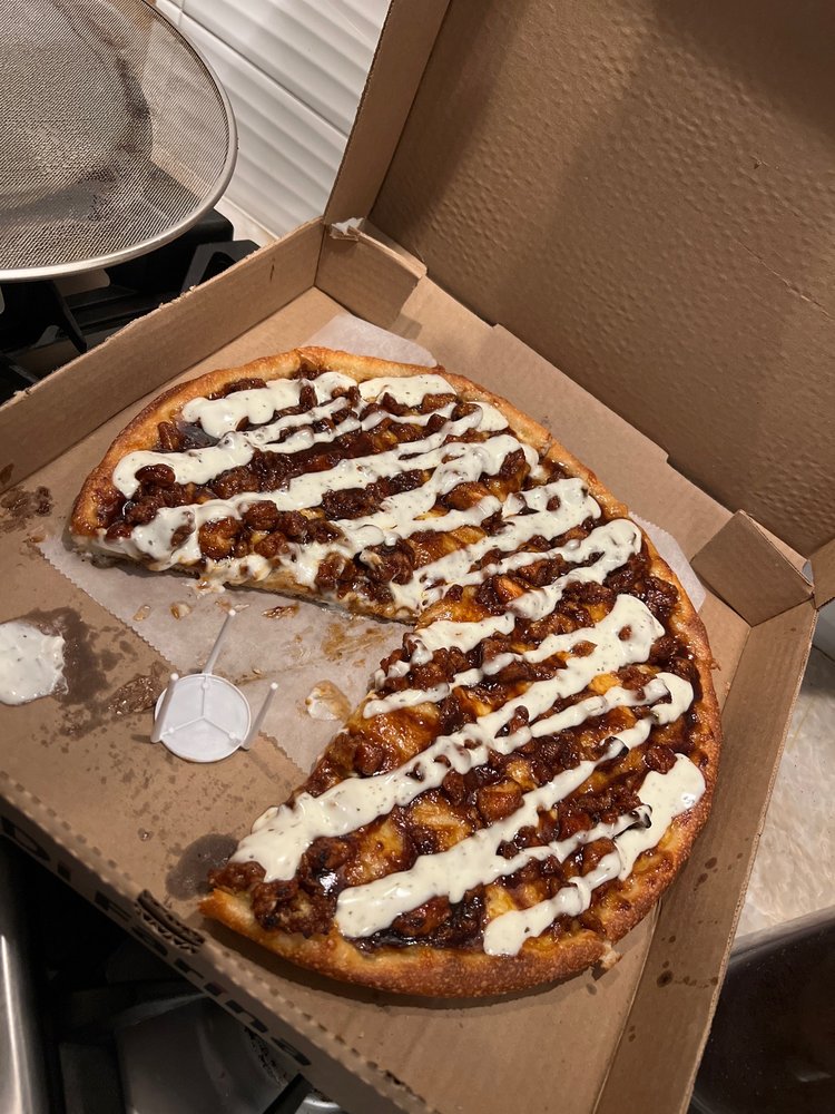 Mozzarella, BBQ sauce, ranch and breaded chicken.